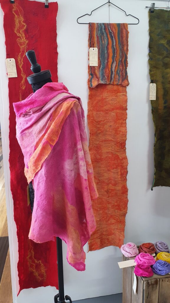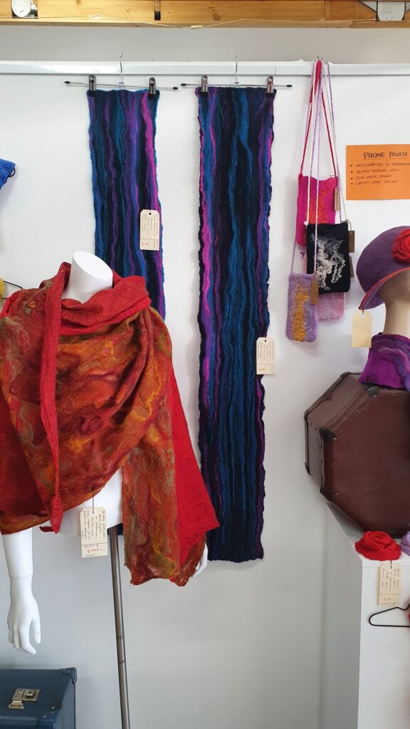 Stuart specialises in felting with Tasmanian merino wool, silk and other natural fibres as he believes it allows him to create more durable and creative designs. He uses this method in the creation of his range of hats, scarfs, wraps, bags and other accessories. Felting provides “more flexibility with the shape of the textiles” and “more flexibility with the fineness of the felt”. This enables him to make pieces that are thick and sturdy through to as fine as gossamer.