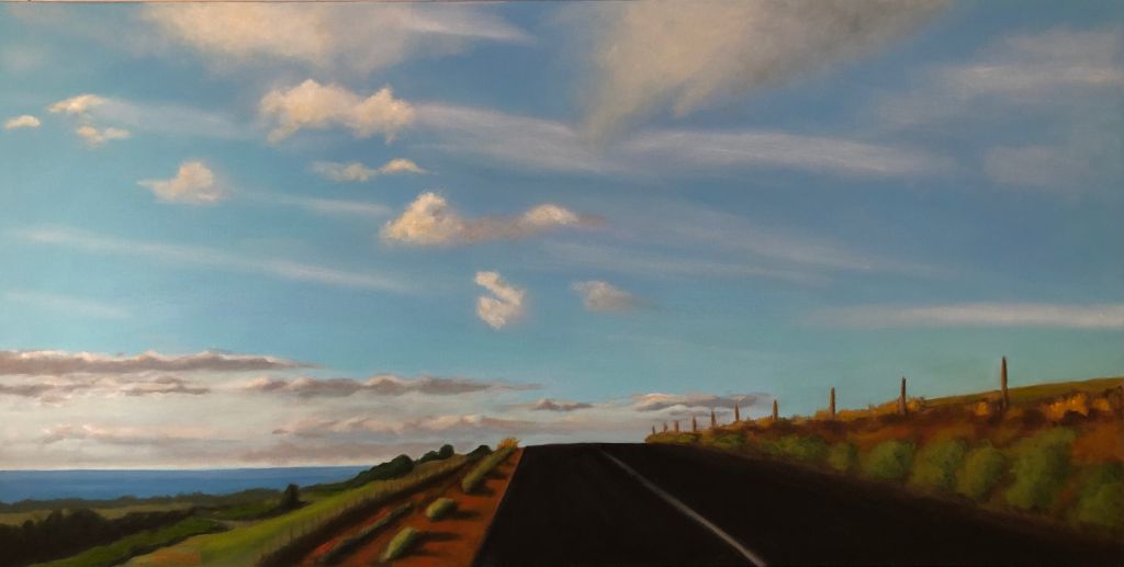 This month’s highlighted painting can be found near the desk as you enter Deloraine Creative, Studios, titled “Ode to John Masefield” who wrote Sea Fever in 1902, which begins “I must go down to the seas again…” I love those words and that beautiful approach over the hills for the first view of the vast Bass Strait, especially in the afternoon. My favorite part of the painting is that late afternoon sky!