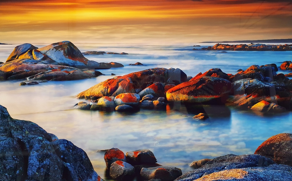 This beautiful work, a sublimation print on aluminum, is a composite creation using images showcasing the beauty of Denison Beach which can be found on the East Coast of Tasmania near Bicheno.